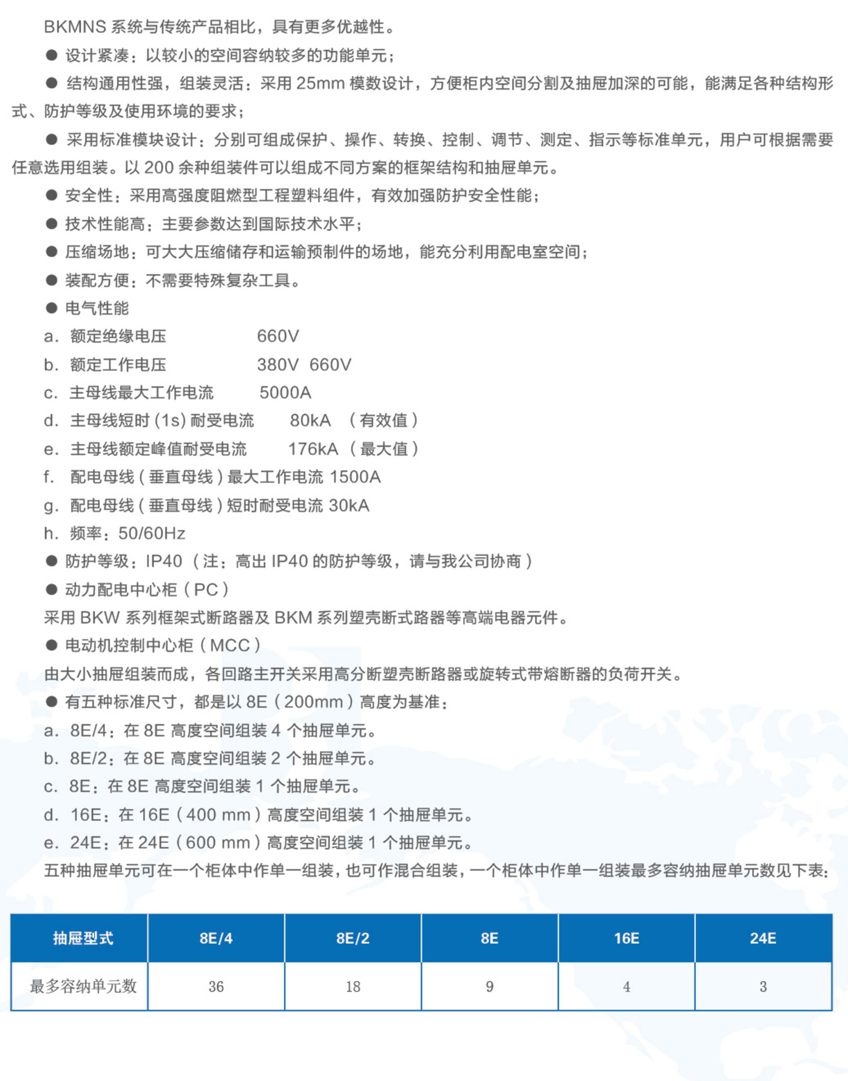 BKMNS 型低壓抽出式開關柜是由模塊化組件組裝而成的組合型抽出式低壓開關柜(以下簡稱裝置)。本裝置適用于發(fā)電廠、變電站、石油化工、冶金軋鋼、輕工紡織等廠礦企業(yè)和住宅小區(qū),高層建筑等場所,作為交流50~60Hz、額定工作電壓660V及以下的低壓配電系統(tǒng)的動力、配電和電動機控制中心、電容補償?shù)鹊碾娔苻D換、分配與控制之用。在大單機容量的發(fā)電廠、大規(guī)模石化等行業(yè)的低壓動力控制中心和電動機控制中心等電力使用場合時,能滿足與計算機接口的特殊需要。裝置是根據(jù)電力部門、廣大電力用戶及設計部門的要求,為滿足不斷發(fā)展的電力市場對增容、計算機接口、動力集中控制、方便安裝維修、縮短事故處理時間等需要,本著安全、經(jīng)濟、合理、可靠的原則設計的新型低壓抽出式開關柜。產(chǎn)品具有分斷,接通能力高、動熱穩(wěn)定性好、電氣方案靈活、組合方便、系列性實用性強、結構新穎、防護等級高等特點,可以作為新型低壓抽出式開關柜供用戶選用。