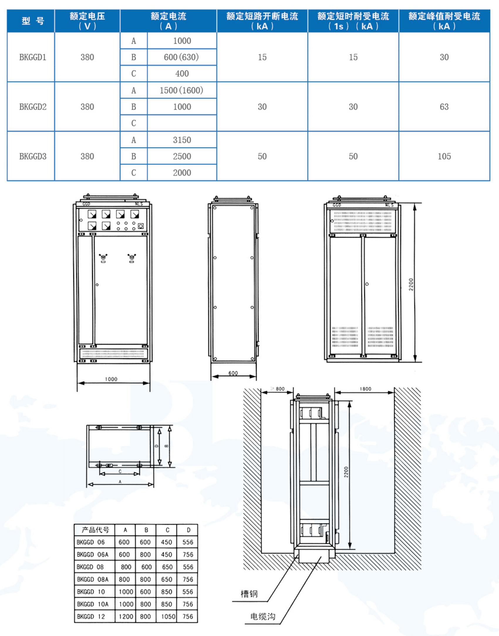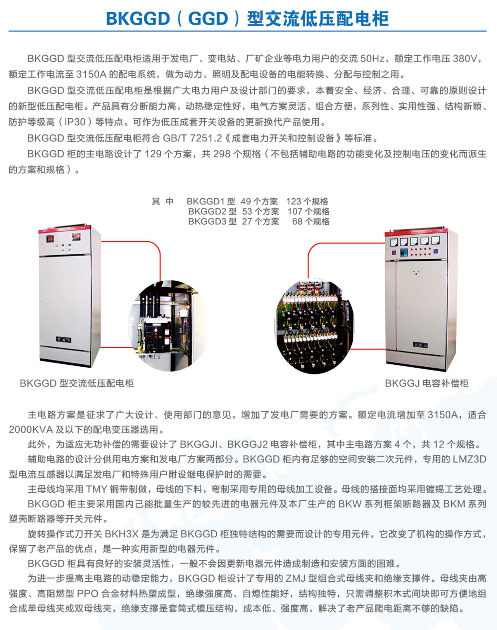 BKGGD型交流低壓配電柜適用于發(fā)電廠、變電站、廠礦企業(yè)等電力用戶的交流50Hz,額定工作電壓380V,額定工作電流至3150A的配電系統(tǒng),做為動力、照明及配電設備的電能轉(zhuǎn)換、分配與控制之用。BKGGD型交流低壓配電柜是根據(jù)廣大電力用戶及設計部門的要求,本著安全、經(jīng)濟、合理、可靠的原則設計的新型低壓配電柜。產(chǎn)品具有分斷能力高,動熱穩(wěn)定性好,電氣方案靈活、組合方便,系列性、實用性強、結構新穎、防護等級高等特點??勺鳛榈蛪撼商组_關設備的更新?lián)Q代產(chǎn)品使用。