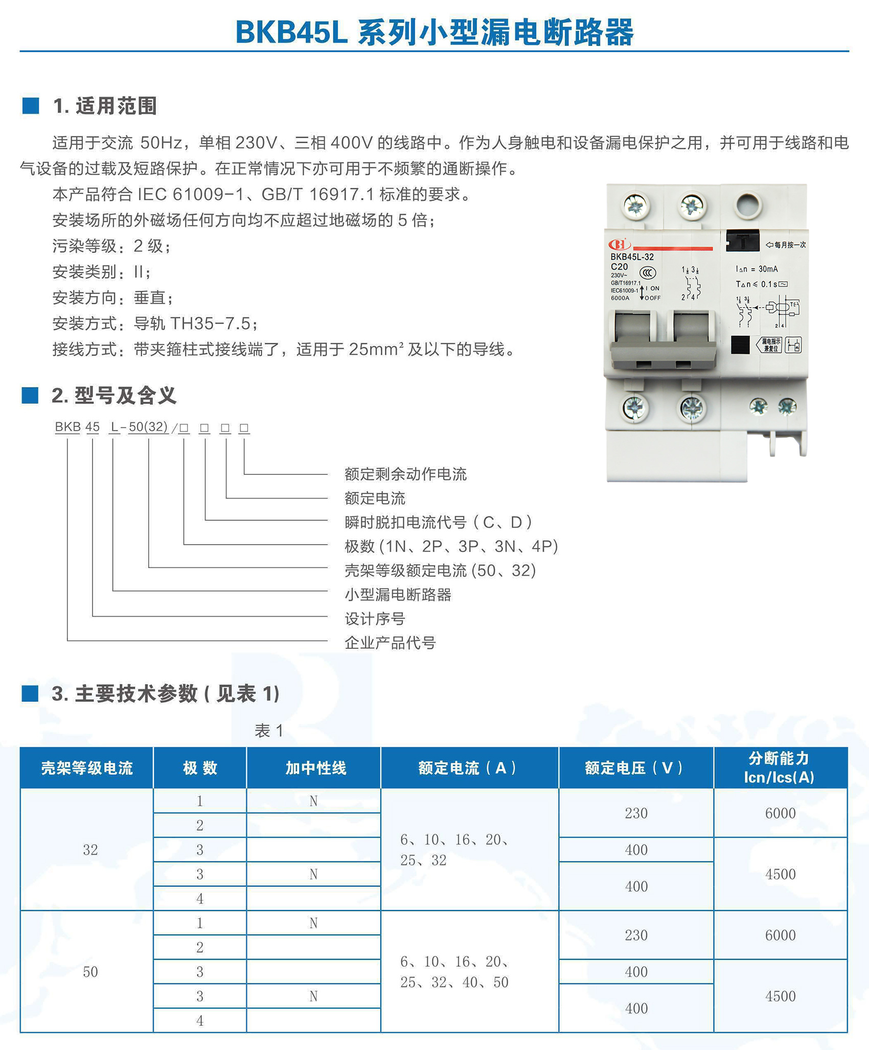 BKB45L-32系列帶剩余電流保護小型斷路器適用于交流50Hz、額定電壓至400V,額定電流6~32A 的線路中。作為人身觸電和設備漏電保護之用,并可用于線路和電氣設備的過載以及短路保護。在正常情況下亦可用于不頻繁的通斷操作。本產(chǎn)品符合GB/T 16917.1、IEC 61009-1標準。