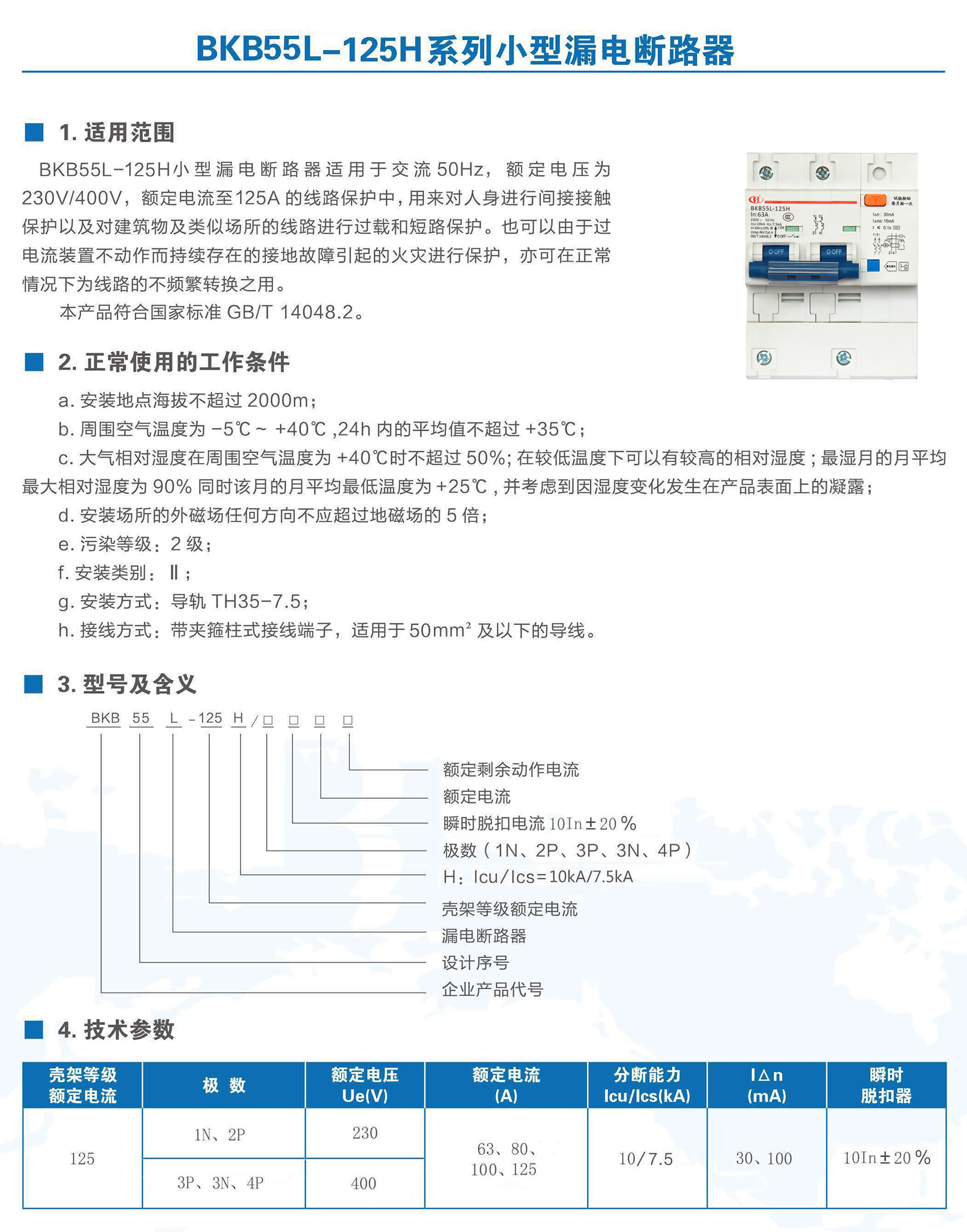 BKB55L-125H系列帶剩余電流保護(hù)小型斷路器適用于交流50Hz、額定電壓至400V,額定電流63~125A 的線路中。作為人身觸電和設(shè)備漏電保護(hù)之用,并可用于線路和電氣設(shè)備的過載以及短路保護(hù)。在正常情況下亦可用于不頻繁的通斷操作。本產(chǎn)品符合GB/T 14048.2、IEC 60947-2標(biāo)準(zhǔn)。