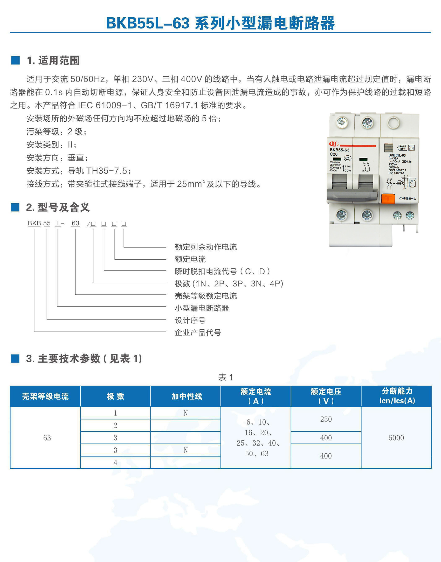 BKB55L-63系列帶剩余電流保護小型斷路器適用于交流50/60Hz、額定電壓至400V,額定電流6~63A 的線路中。作為人身觸電和設(shè)備漏電保護之用,并可用于線路和電氣設(shè)備的過載以及短路保護。在正常情況下亦可用于不頻繁的通斷操作。本產(chǎn)品符合GB/T 16917.1、IEC 61009-1標(biāo)準(zhǔn)。